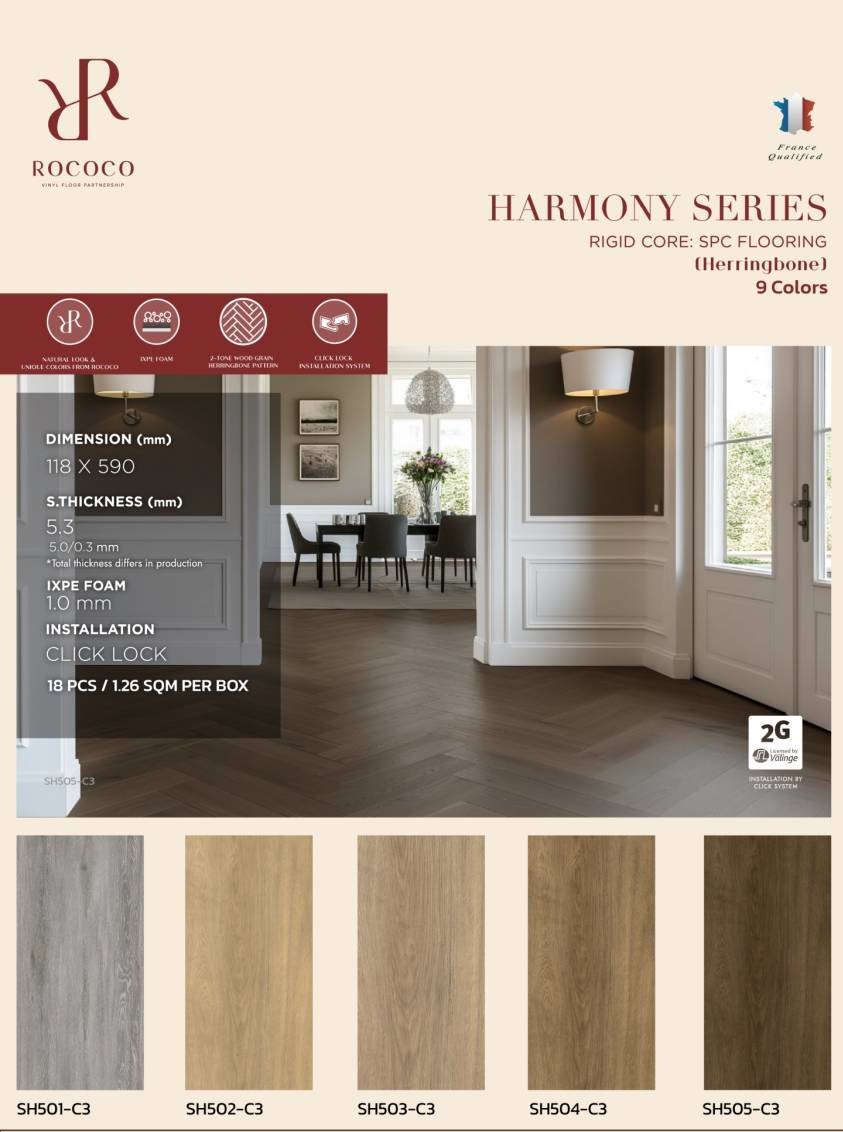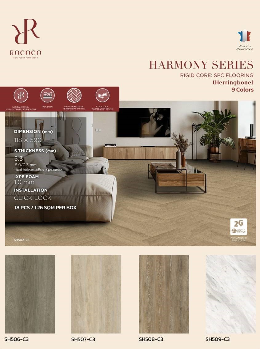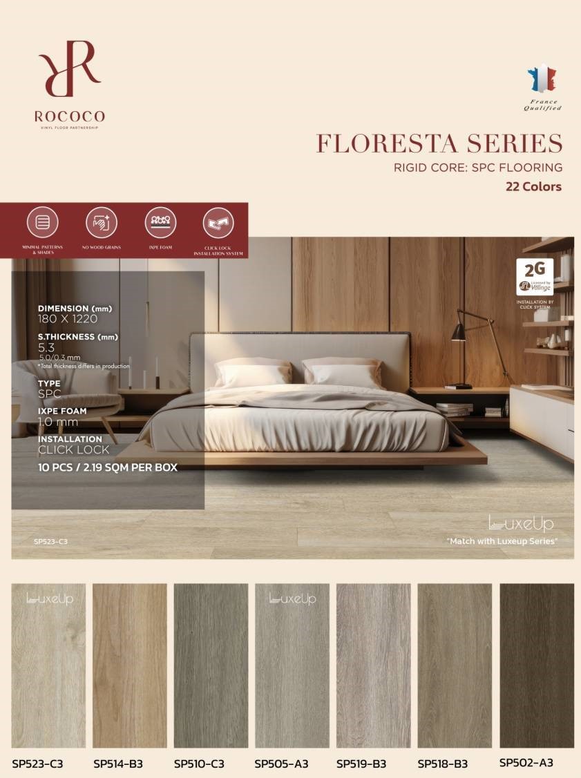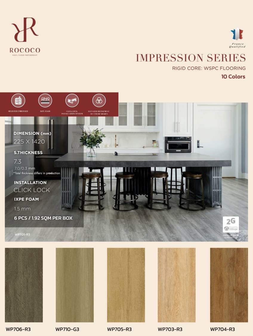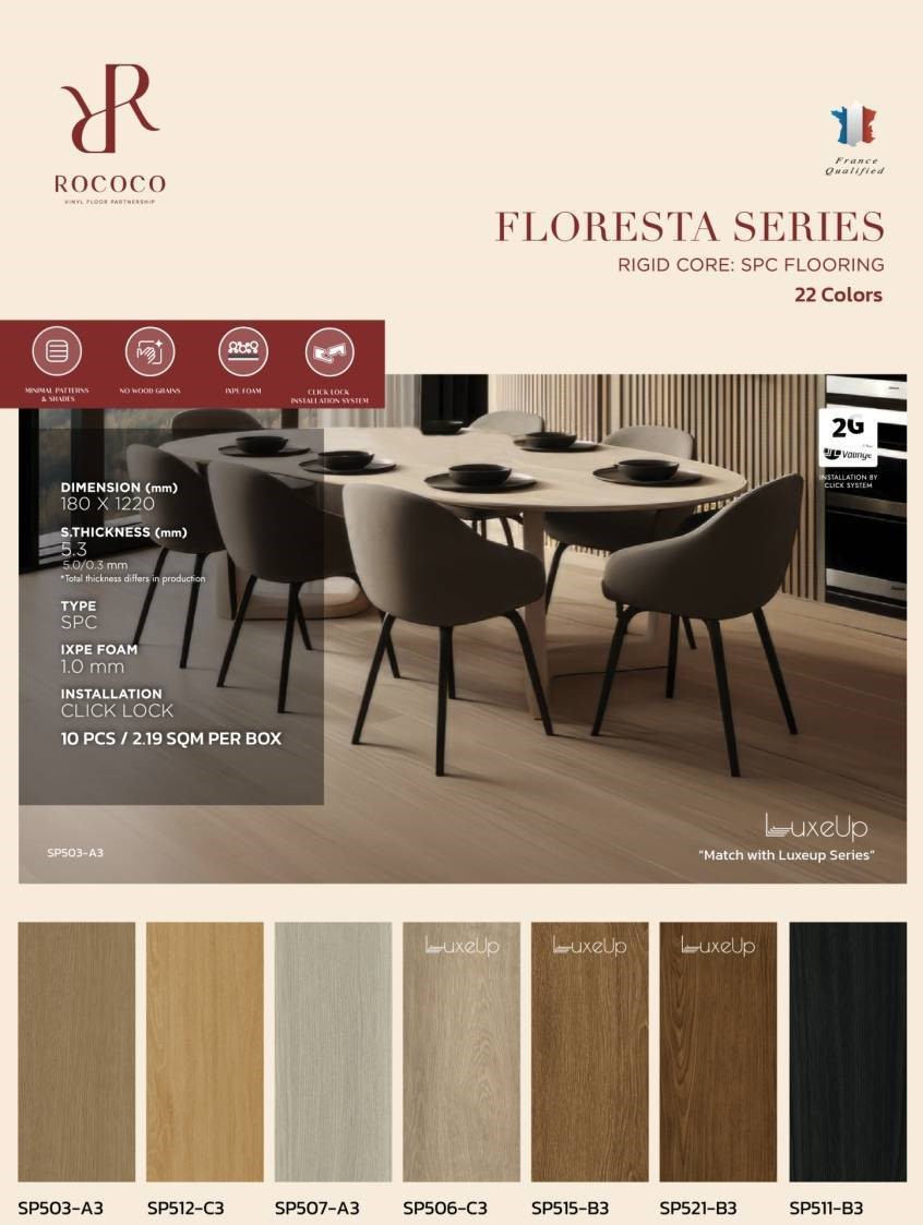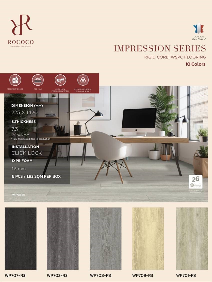 กระเบื้องยาง Click Lock Rococo นำเข้าจาากต่างประเทศ สินค้าคุณภาพสูง มีทั้งแบบไวนิล 4 มม, SPC 5 มม และ WPC 7 มม สำหรับงานที่เน้นความทนทาน หรูหรา ให้ความรู้สึกเหมือนไม้จริง